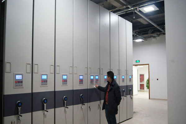 智能型密集架提供多组通风接口,工作人员可根据智能温度计的显示温湿度,单击 “通风”按扭,各通风接口即自动工作,维护密集架整体的保存环境。